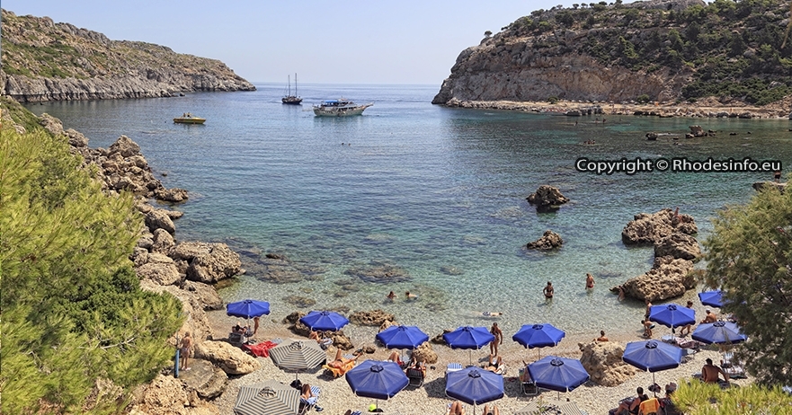 It is considered to be one of the most beautiful and relatively quiet beaches of Rhodes, 250 meters long, with beautiful sand, pebbles and rocks. It is not organized, but provides chairs and umbrellas. The colored waters and rocky seabed makes it ideal for underwater swimming. Note that the water is very cold.